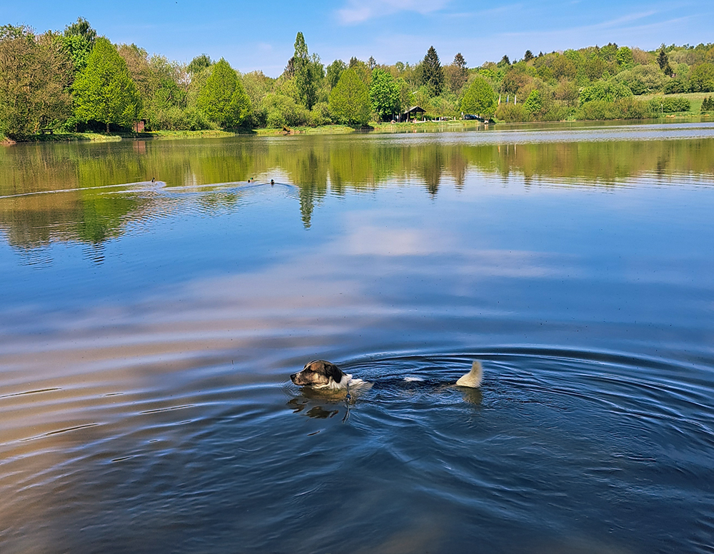 Auch beim Thema Bewegung bin ich konsequent: Bueno bekommt viel Auslauf, aber kontrolliert. Ich achte darauf, dass wir gelenkschonende Bewegung in den Alltag integrieren. Zu wildes Herumtoben auf hartem Untergrund oder ständiges Hoch- und Runterspringen versuche ich zu vermeiden. Stattdessen setzen wir auf lange Spaziergänge in moderatem Tempo, am liebsten in der Natur. Sobald es wärmer wird, darf Bueno regelmäßig schwimmen – eine der besten Bewegungsformen für die Stärkung der Muskulatur ohne Gelenkbelastung.