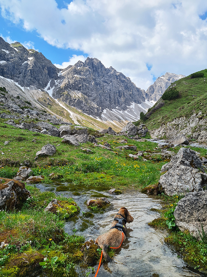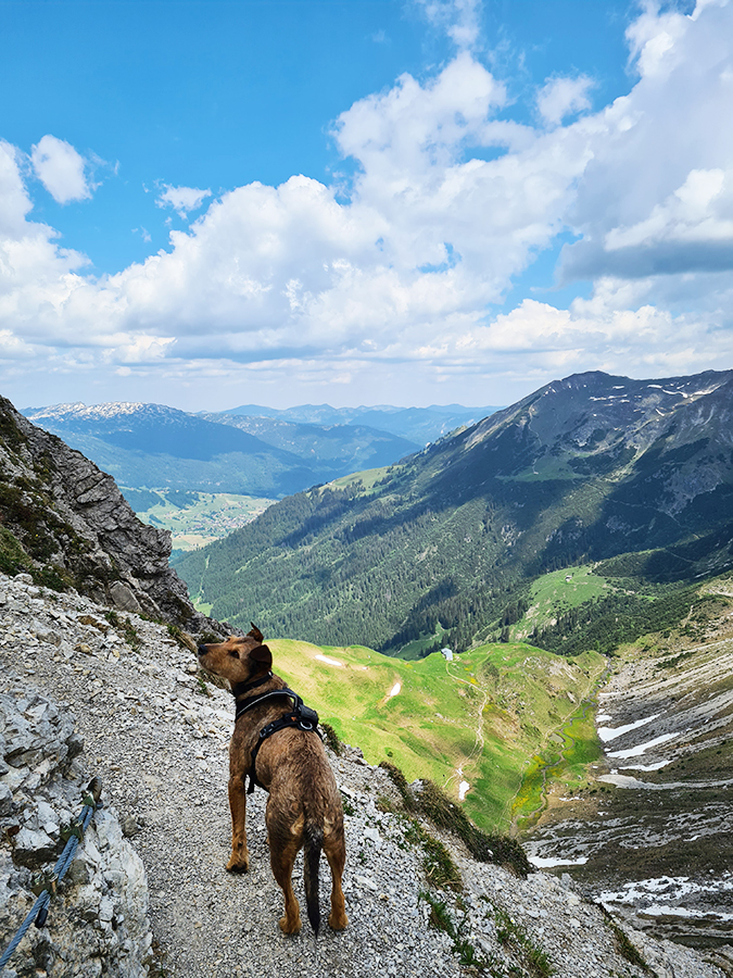 Ich werde nicht enttäuscht, denn Beppo scheint sich der Ernsthaftigkeit des Anstieges voll und ganz bewusst. Er reagiert perfekt auf mich und steigt jede Passage vor, während er daraufhin auf mich wartet. Von diesem immer noch recht wilden Streuner hätte ich so eine Disziplin auf Anhieb nicht erwartet. Das pusht mich umso mehr. Gemeinsam erreichen wir das Ende des Rappenalptals und durchschreiten nochmal ein kleines Stückchen Deutschland. Hier befindet sich übrigens der südlichste Punkt, am Haldenwanger Eck. Über einen weiteren Pass, den Schrofenpass überschreiten wir dann die Bergkette des Lechtals, einer der schönsten Täler Österreichs. Von hier aus geht es über saftige Wiesen – denn wir laufen jetzt auf der Südseite - hinab in ebenjenes Tal. Nach etwa sieben Stunden erreichen wir Warth, von wo wir aus versuchen, zu unserer Unterkunft zu trampen.