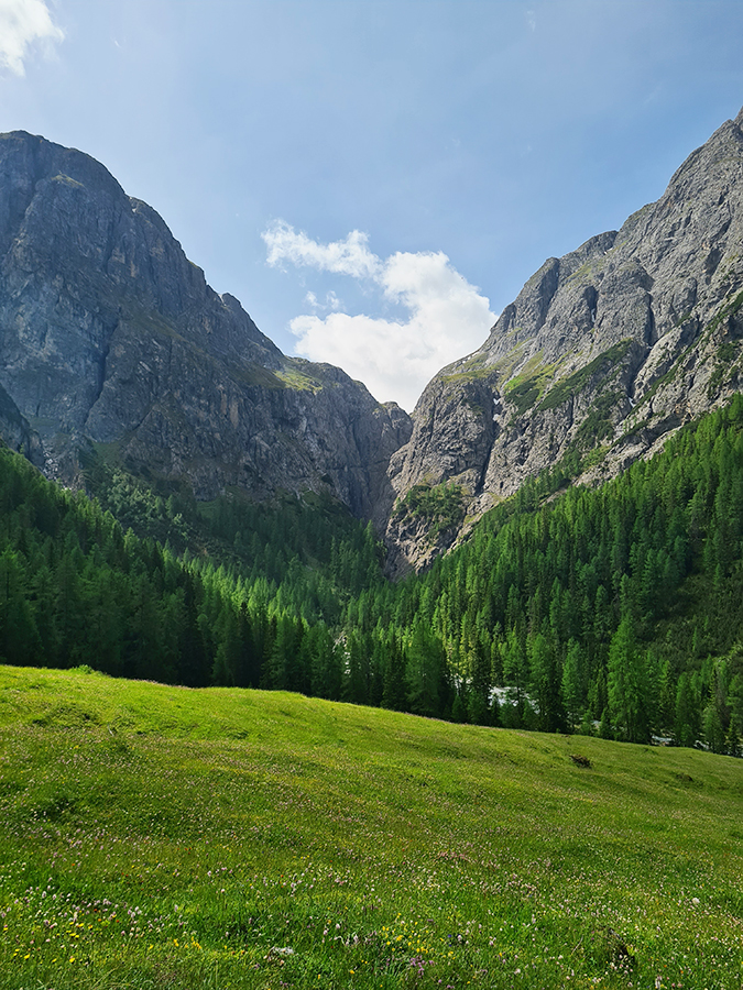 Jetzt gab es keine Ausreden mehr! Genug vorbereitet, jetzt geht es endlich los.Beppo und ich fuhren voller Tatendrang von Oberstdorf nach Mittelberg ins Kleinwalsertal. Hier startet unsere Route, die uns durch das enge Wildental führt. Das Wetter ist perfekt. Immer wieder ein Wechsel aus Wolken und Wind, der die aufsteigende Sommersonne in Zaum hält. Wir starten gegen halb sieben, um genug Zeit auf dem Weg zu haben. Vorbei an einem beeindruckenden Wasserfall, der sich mutig von einer höher liegenden Talsohle in die Tiefe stürzt stiegen wir über die Baumgrenze, um die geröllige Umgebung zu erreichen. Hier geht es steil bergauf und unsere Trittsicherheit wird direkt auf die Probe gestellt.