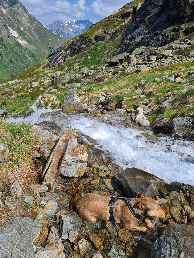 Das Panorama ist atemberaubend, da mittlerweile wenig bis gar keine Zeichen menschlicher Veränderungen im Gelände zu erkennen. Natürlich stört der Lift für die Anlieferungen zur Edmund – Graf Hütte ein wenig, aber ansonsten ist hier nur die pure, natürliche Bergwelt um uns herum. Beppo liebt es, badet immer wieder im links von uns fließenden Schmelzwasserbach, rutscht auf dem Schnee herum und leitet mich – als ob er der Wanderführer ist sicher bis zur Hütte hinauf.