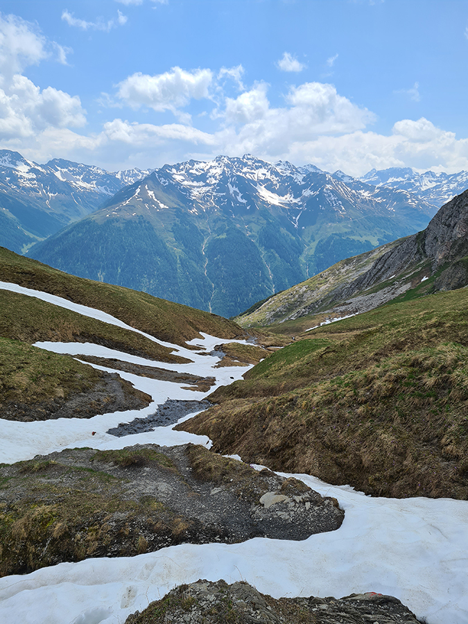 Früh morgens um sechs mussten wir aufbrechen, um einem herannahenden Gewitter zuvor zu kommen. Wir stiegen den Fimberpass hinauf und erhielten auf 2700m eine Sicht auf das vor uns liegende „Val Sinestra“.