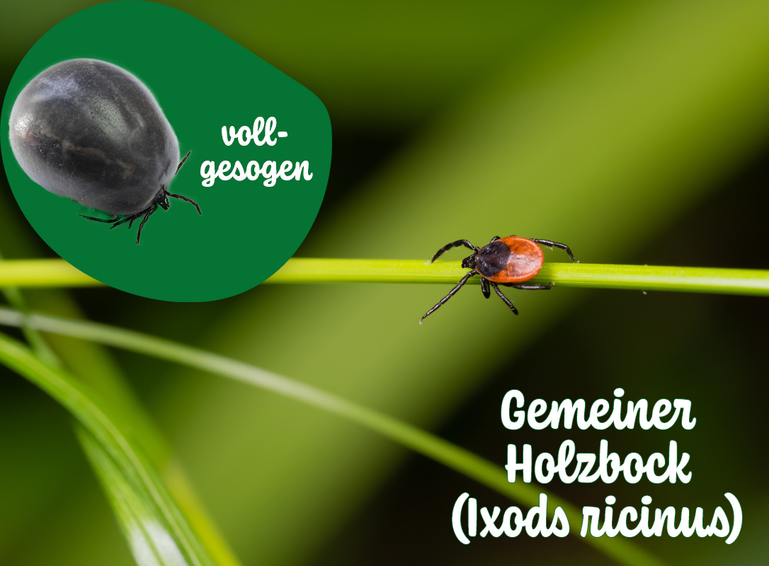 Gemeiner Holzbock | 2,5–4 mm groß, | Ganz Deutschland | März bis | Borreliose |
