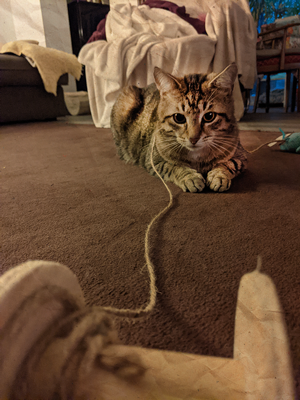 Was auch super funktioniert: verstecke etwas unter einer Teppich-Ecke. Z.B. den kleinen Ball oder die Kapsel aus dem Ü-Ei. Damit ist Deine Mieze sicher eine Weile beschäftigt. Mein Batman sitzt manchmal auf dem Gegenstand unter der Teppich-Ecke, als wolle er ihn ausbrüten. Oder er liegt auch unterm Teppich - ein Bild für die Götter!